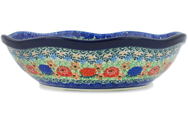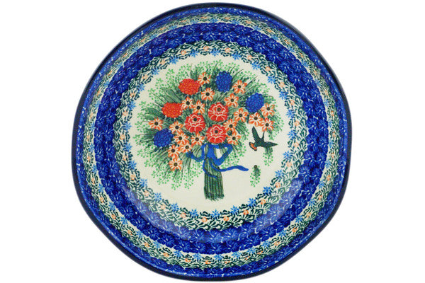 This Hummingbird Bouquet 10" Scalloped Bowl was handmade and hand decorated in Boleslawiec, Poland by skilled artisans according to old traditional methods. This is a Polish pottery Signature Unikat, which means that it has been hand painted with both sponges and brushes and it is signed by the artist who painted it. Unikat pieces are the most intricate works of art. Larger Unikat items take hours of very careful work to finish. This Polish stoneware is microwave, dishwasher, freezer, and oven safe up to 480°F. It does not contain lead or cadmium. It is part of the Hummingbird Bouquet Collection.