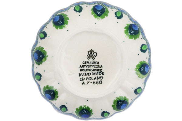 This Peacock Feather 5" Scalloped Fluted Bowl was handmade and hand decorated in Boleslawiec, Poland by skilled artisans according to old traditional methods. This Polish stoneware is microwave, dishwasher, freezer, and oven safe up to 480°F. It does not contain lead or cadmium. It is part of the Peacock Feather Collection.