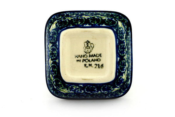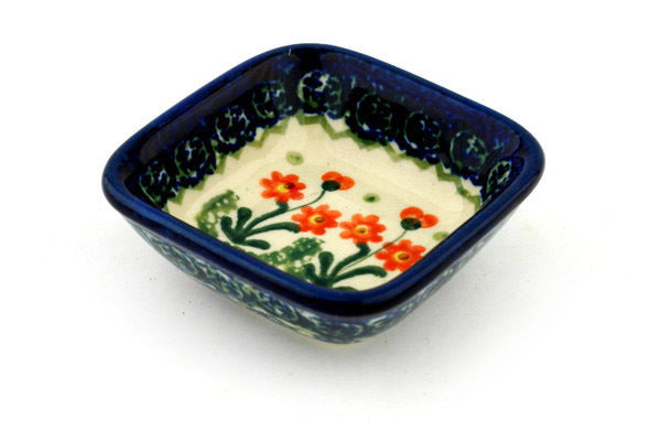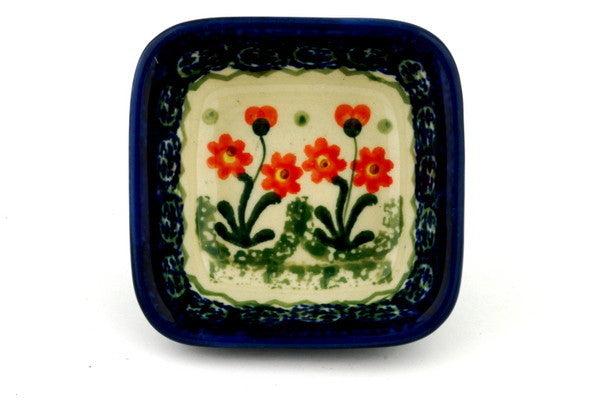This Peach Spring Daisy 3" Square Bowl was handmade and hand decorated in Boleslawiec, Poland by skilled artisans according to old traditional methods. This Polish stoneware is microwave, dishwasher, freezer, and oven safe up to 480°F. It does not contain lead or cadmium. It is part of the Peach Spring Daisy Collection.