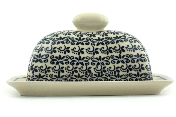 This Black Lace Vines 7" Butter Dish was handmade and hand decorated in Boleslawiec, Poland by skilled artisans according to old traditional methods. This Polish stoneware is microwave, dishwasher, freezer, and oven safe up to 480°F. It does not contain lead or cadmium. It is part of the Black Lace Vines Collection.