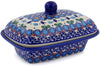 This Blue Tulip Garden 7" Butter Dish was handmade and hand decorated in Boleslawiec, Poland by skilled artisans according to old traditional methods. This is a Polish pottery Signature Unikat, which means that it has been hand painted with both sponges and brushes and it is signed by the artist who painted it. Unikat pieces are the most intricate works of art. Larger Unikat items take hours of very careful work to finish. This Polish stoneware is microwave, dishwasher, freezer, and oven safe up to 480°F. It does not contain lead or cadmium. It is part of the Blue Tulip Garden Collection.