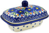 This Lightbug Garden 7" Butter Dish was handmade and hand decorated in Boleslawiec, Poland by skilled artisans according to old traditional methods. This is a Polish pottery Signature Unikat, which means that it has been hand painted with both sponges and brushes and it is signed by the artist who painted it. Unikat pieces are the most intricate works of art. Larger Unikat items take hours of very careful work to finish. This Polish stoneware is microwave, dishwasher, freezer, and oven safe up to 480°F. It does not contain lead or cadmium. It is part of the Lightbug Garden Collection.