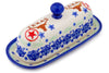 This Woodland Whirl 7" Butter Dish was handmade and hand decorated in Boleslawiec, Poland by skilled artisans according to old traditional methods. This is a Polish pottery Signature Unikat, which means that it has been hand painted with both sponges and brushes and it is signed by the artist who painted it. Unikat pieces are the most intricate works of art. Larger Unikat items take hours of very careful work to finish. This Polish stoneware is microwave, dishwasher, freezer, and oven safe up to 480°F. It does not contain lead or cadmium. It is part of the Woodland Whirl Collection.