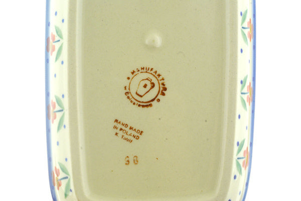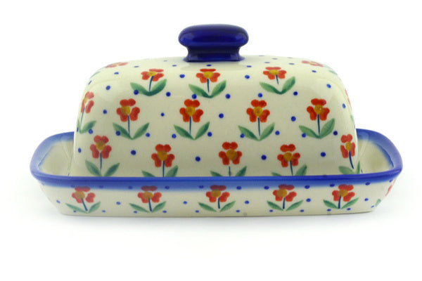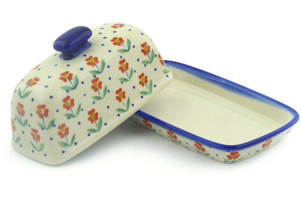 This Red Primrose 8" Butter Dish was handmade and hand decorated in Boleslawiec, Poland by skilled artisans according to old traditional methods. This Polish stoneware is microwave, dishwasher, freezer, and oven safe up to 480°F. It does not contain lead or cadmium. It is part of the Red Primrose Collection.
