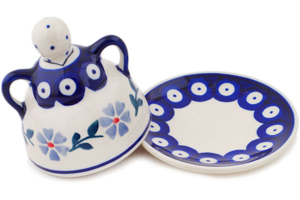 This Peacock Forget-Me-Not 4" Cheese Lady was handmade and hand decorated in Boleslawiec, Poland by skilled artisans according to old traditional methods. This Polish stoneware is microwave, dishwasher, freezer, and oven safe up to 480°F. It does not contain lead or cadmium. It is part of the Peacock Forget-Me-Not Collection.