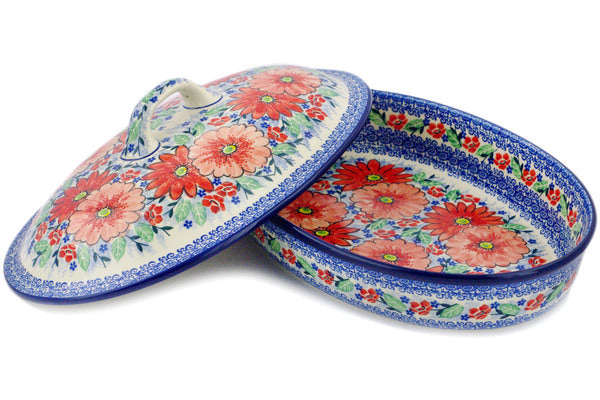 This Peak Of Perfection 14" Baker with Cover was handmade and hand decorated in Boleslawiec, Poland by skilled artisans according to old traditional methods. This is a Polish pottery Signature Unikat, which means that it has been hand painted with both sponges and brushes and it is signed by the artist who painted it. Unikat pieces are the most intricate works of art. Larger Unikat items take hours of very careful work to finish. This Polish stoneware is microwave, dishwasher, freezer, and oven safe up to 480°F. It does not contain lead or cadmium. It is part of the Peak Of Perfection Collection.