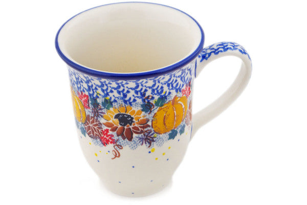 This Autumn Falling Leaves 17 oz Bistro Mug was handmade and hand decorated in Boleslawiec, Poland by skilled artisans according to old traditional methods. This is a Polish pottery Signature Unikat, which means that it has been hand painted with both sponges and brushes and it is signed by the artist who painted it. Unikat pieces are the most intricate works of art. Larger Unikat items take hours of very careful work to finish. This Polish stoneware is microwave, dishwasher, freezer, and oven safe up to 480°F. It does not contain lead or cadmium. It is part of the Autumn Falling Leaves Collection.