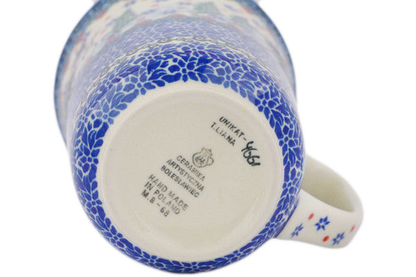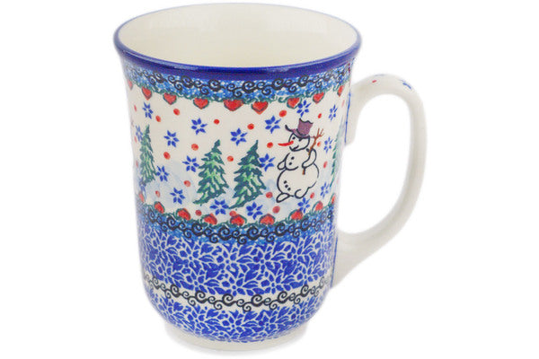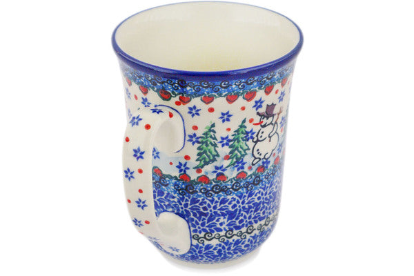 This Dancing Snowman 17 oz Bistro Mug was handmade and hand decorated in Boleslawiec, Poland by skilled artisans according to old traditional methods. This is a Polish pottery Signature Unikat, which means that it has been hand painted with both sponges and brushes and it is signed by the artist who painted it. Unikat pieces are the most intricate works of art. Larger Unikat items take hours of very careful work to finish. This Polish stoneware is microwave, dishwasher, freezer, and oven safe up to 480°F. It does not contain lead or cadmium. It is part of the Dancing Snowman Collection.