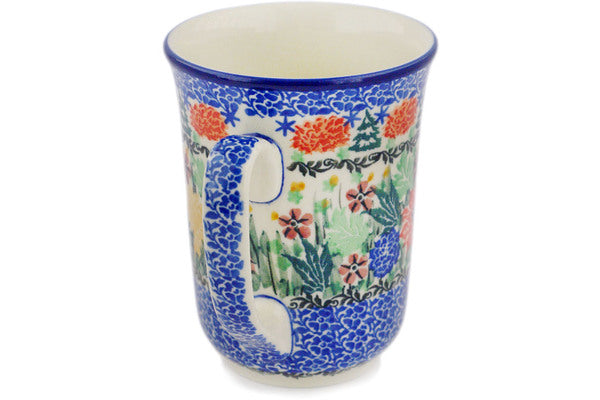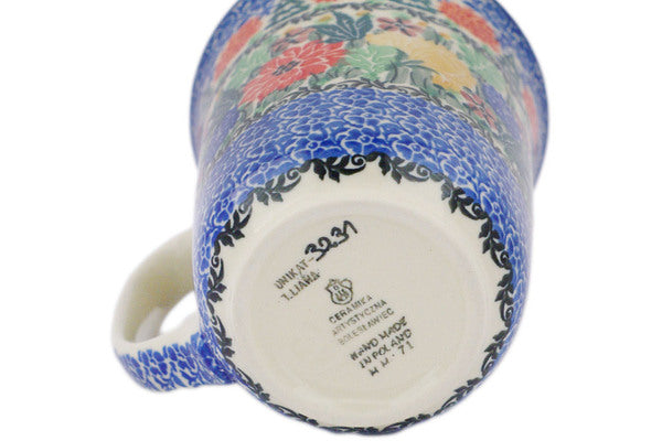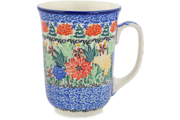 This Hidden Pines 17 oz Bistro Mug was handmade and hand decorated in Boleslawiec, Poland by skilled artisans according to old traditional methods. This is a Polish pottery Signature Unikat, which means that it has been hand painted with both sponges and brushes and it is signed by the artist who painted it. Unikat pieces are the most intricate works of art. Larger Unikat items take hours of very careful work to finish. This Polish stoneware is microwave, dishwasher, freezer, and oven safe up to 480°F. It does not contain lead or cadmium. It is part of the Hidden Pines Collection.