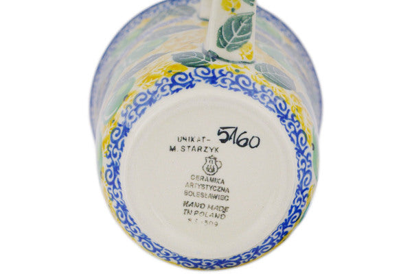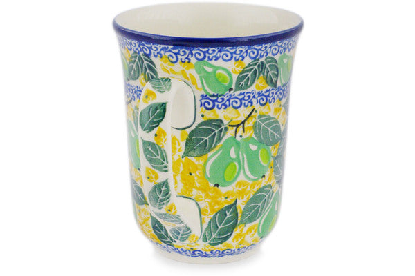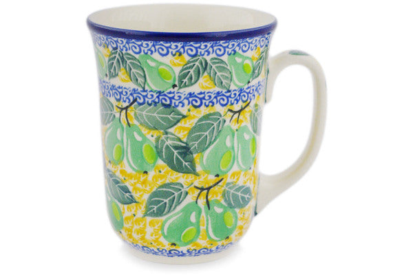 This Pear Tree 17 oz Bistro Mug was handmade and hand decorated in Boleslawiec, Poland by skilled artisans according to old traditional methods. This is a Polish pottery Signature Unikat, which means that it has been hand painted with both sponges and brushes and it is signed by the artist who painted it. Unikat pieces are the most intricate works of art. Larger Unikat items take hours of very careful work to finish. This Polish stoneware is microwave, dishwasher, freezer, and oven safe up to 480°F. It does not contain lead or cadmium. It is part of the Pear Tree Collection.