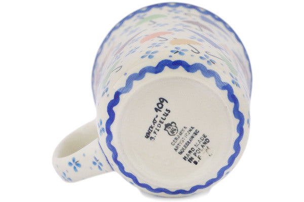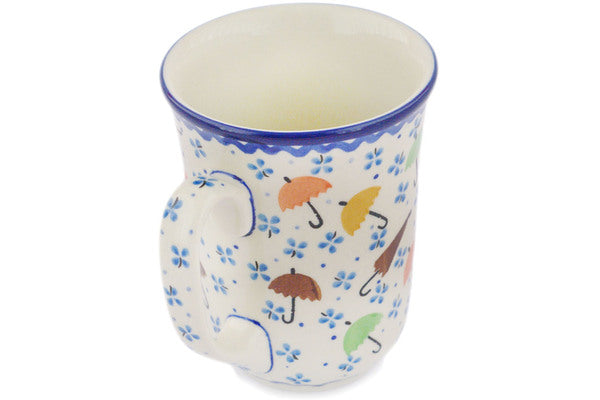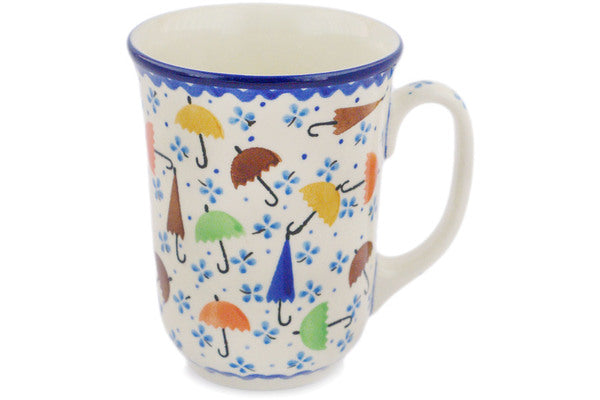 This Raining Umbrellas 17 oz Bistro Mug was handmade and hand decorated in Boleslawiec, Poland by skilled artisans according to old traditional methods. This is a Polish pottery Signature Unikat, which means that it has been hand painted with both sponges and brushes and it is signed by the artist who painted it. Unikat pieces are the most intricate works of art. Larger Unikat items take hours of very careful work to finish. This Polish stoneware is microwave, dishwasher, freezer, and oven safe up to 480°F. It does not contain lead or cadmium. It is part of the Raining Umbrellas Collection.