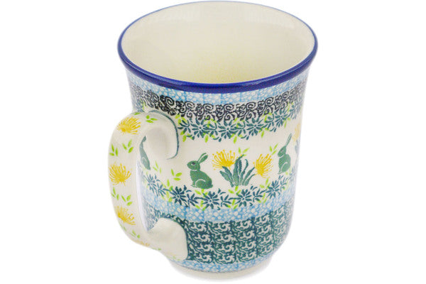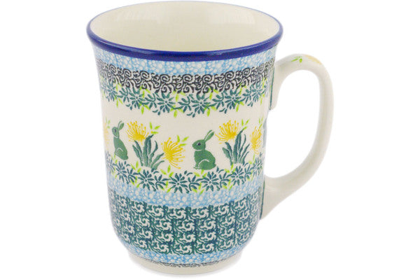 This Riveting Rabbits 17 oz Bistro Mug was handmade and hand decorated in Boleslawiec, Poland by skilled artisans according to old traditional methods. This is a Polish pottery Signature Unikat, which means that it has been hand painted with both sponges and brushes and it is signed by the artist who painted it. Unikat pieces are the most intricate works of art. Larger Unikat items take hours of very careful work to finish. This Polish stoneware is microwave, dishwasher, freezer, and oven safe up to 480°F. It does not contain lead or cadmium. It is part of the Riveting Rabbits Collection.