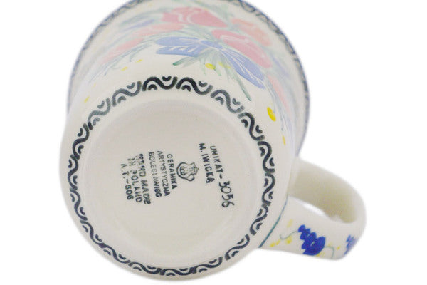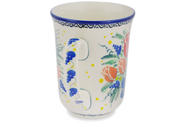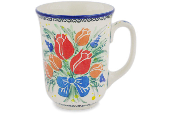 This Tulip Bouquet 17 oz Bistro Mug was handmade and hand decorated in Boleslawiec, Poland by skilled artisans according to old traditional methods. This is a Polish pottery Signature Unikat, which means that it has been hand painted with both sponges and brushes and it is signed by the artist who painted it. Unikat pieces are the most intricate works of art. Larger Unikat items take hours of very careful work to finish. This Polish stoneware is microwave, dishwasher, freezer, and oven safe up to 480°F. It does not contain lead or cadmium. It is part of the Tulip Bouquet Collection.