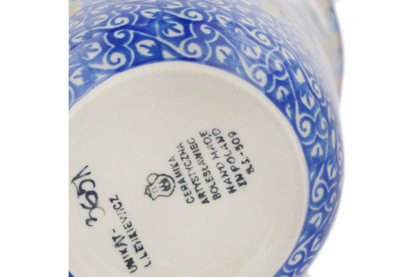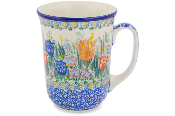 This Tulip Garden 17 oz Bistro Mug was handmade and hand decorated in Boleslawiec, Poland by skilled artisans according to old traditional methods. This is a Polish pottery Signature Unikat, which means that it has been hand painted with both sponges and brushes and it is signed by the artist who painted it. Unikat pieces are the most intricate works of art. Larger Unikat items take hours of very careful work to finish. This Polish stoneware is microwave, dishwasher, freezer, and oven safe up to 480°F. It does not contain lead or cadmium. It is part of the Tulip Garden Collection.