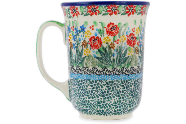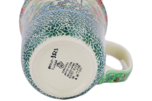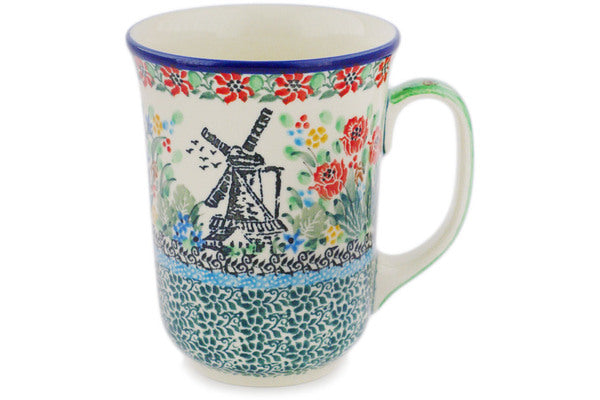 This Windmill Meadow 17 oz Bistro Mug was handmade and hand decorated in Boleslawiec, Poland by skilled artisans according to old traditional methods. This is a Polish pottery Signature Unikat, which means that it has been hand painted with both sponges and brushes and it is signed by the artist who painted it. Unikat pieces are the most intricate works of art. Larger Unikat items take hours of very careful work to finish. This Polish stoneware is microwave, dishwasher, freezer, and oven safe up to 480°F. It does not contain lead or cadmium. It is part of the Windmill Meadow Collection.