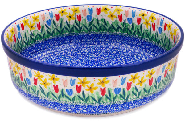 This Summer Tulip 12" Bowl was handmade and hand decorated in Boleslawiec, Poland by skilled artisans according to old traditional methods. This is a Polish pottery Signature Unikat, which means that it has been hand painted with both sponges and brushes and it is signed by the artist who painted it. Unikat pieces are the most intricate works of art. Larger Unikat items take hours of very careful work to finish. This Polish stoneware is microwave, dishwasher, freezer, and oven safe up to 480°F. It does not contain lead or cadmium. It is part of the Summer Tulip Collection.