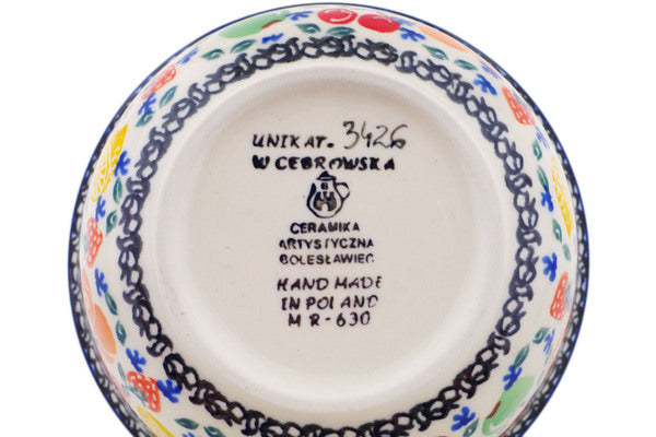 This Tutti Frutti 5" Bowl was handmade and hand decorated in Boleslawiec, Poland by skilled artisans according to old traditional methods. This is a Polish pottery Signature Unikat, which means that it has been hand painted with both sponges and brushes and it is signed by the artist who painted it. Unikat pieces are the most intricate works of art. Larger Unikat items take hours of very careful work to finish. This Polish stoneware is microwave, dishwasher, freezer, and oven safe up to 480°F. It does not contain lead or cadmium. It is part of the Tutti Frutti Collection.