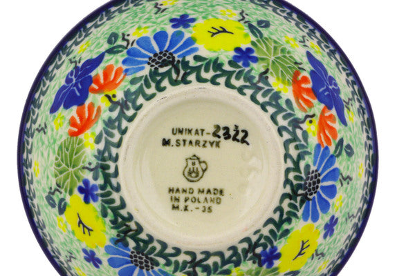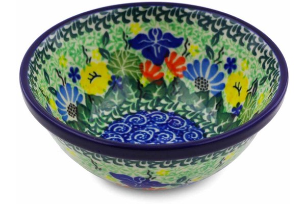 This Wildflower Wreath 5" Bowl was handmade and hand decorated in Boleslawiec, Poland by skilled artisans according to old traditional methods. This is a Polish pottery Signature Unikat, which means that it has been hand painted with both sponges and brushes and it is signed by the artist who painted it. Unikat pieces are the most intricate works of art. Larger Unikat items take hours of very careful work to finish. This Polish stoneware is microwave, dishwasher, freezer, and oven safe up to 480°F. It does not contain lead or cadmium. It is part of the Wildflower Wreath Collection.