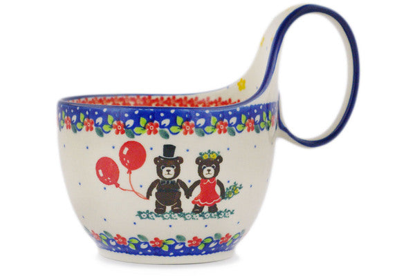 This Bear Party Duo 16 oz Bowl with Loop-Handle was handmade and hand decorated in Boleslawiec, Poland by skilled artisans according to old traditional methods. This is a Polish pottery Signature Unikat, which means that it has been hand painted with both sponges and brushes and it is signed by the artist who painted it. Unikat pieces are the most intricate works of art. Larger Unikat items take hours of very careful work to finish. This Polish stoneware is microwave, dishwasher, freezer, and oven safe up to 480°F. It does not contain lead or cadmium. It is part of the Bear Party Duo Collection.
