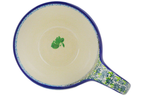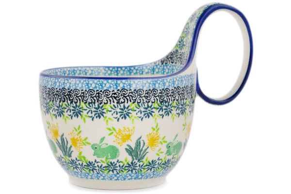 This Bountiful Bunnies 16 oz Bowl with Loop-Handle was handmade and hand decorated in Boleslawiec, Poland by skilled artisans according to old traditional methods. This is a Polish pottery Signature Unikat, which means that it has been hand painted with both sponges and brushes and it is signed by the artist who painted it. Unikat pieces are the most intricate works of art. Larger Unikat items take hours of very careful work to finish. This Polish stoneware is microwave, dishwasher, freezer, and oven safe up to 480°F. It does not contain lead or cadmium. It is part of the Bountiful Bunnies Collection.