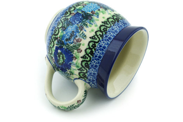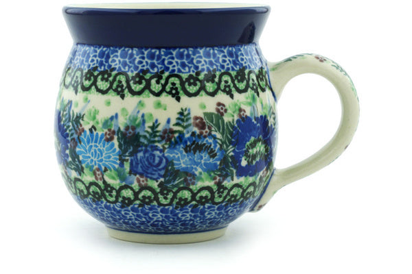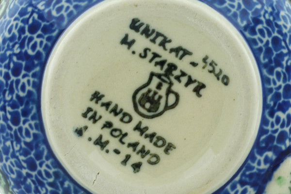 This Blue Meadow 12oz Bubble Mug was handmade and hand decorated in Boleslawiec, Poland by skilled artisans according to old traditional methods. This is a Polish pottery Signature Unikat, which means that it has been hand painted with both sponges and brushes and it is signed by the artist who painted it. Unikat pieces are the most intricate works of art. Larger Unikat items take hours of very careful work to finish. This Polish stoneware is microwave, dishwasher, freezer, and oven safe up to 480°F. It does not contain lead or cadmium. It is part of the Blue Meadow Collection.