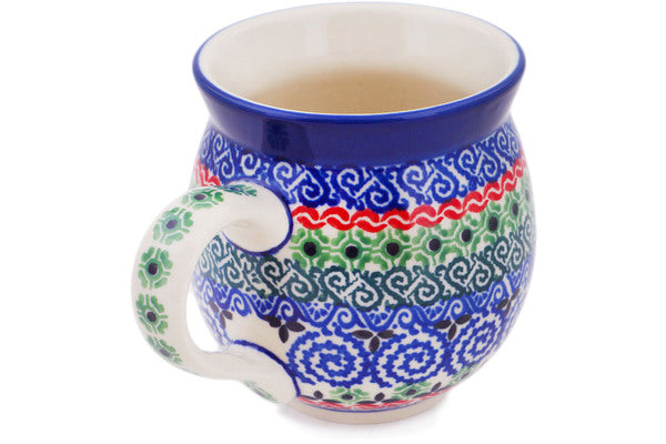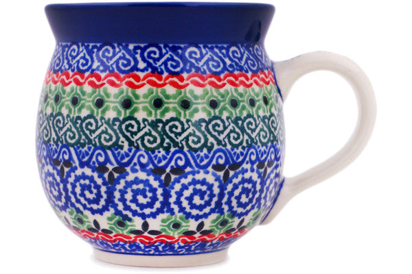 This Wheel Window 12oz Bubble Mug was handmade and hand decorated in Boleslawiec, Poland by skilled artisans according to old traditional methods. This is a Polish pottery Signature Unikat, which means that it has been hand painted with both sponges and brushes and it is signed by the artist who painted it. Unikat pieces are the most intricate works of art. Larger Unikat items take hours of very careful work to finish. This Polish stoneware is microwave, dishwasher, freezer, and oven safe up to 480°F. It does not contain lead or cadmium. It is part of the Wheel Window Collection.