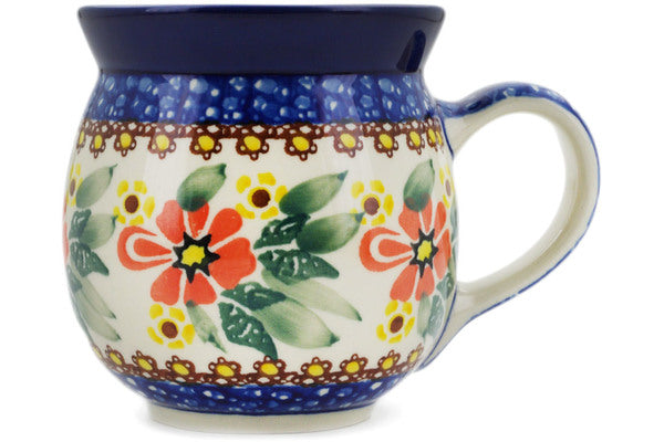 This Hidden Sunflower 16 oz Bubble Mug was handmade and hand decorated in Boleslawiec, Poland by skilled artisans according to old traditional methods. This is a Polish pottery Signature Unikat, which means that it has been hand painted with both sponges and brushes and it is signed by the artist who painted it. Unikat pieces are the most intricate works of art. Larger Unikat items take hours of very careful work to finish. This Polish stoneware is microwave, dishwasher, freezer, and oven safe up to 480°F. It does not contain lead or cadmium. It is part of the Hidden Sunflower Collection.