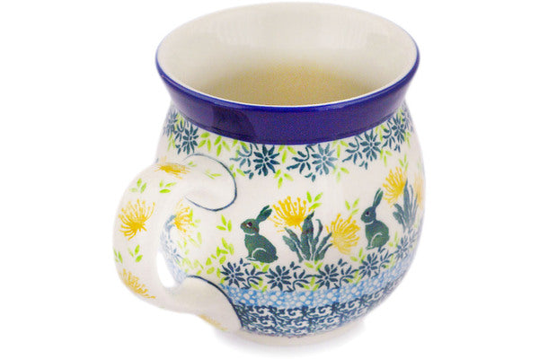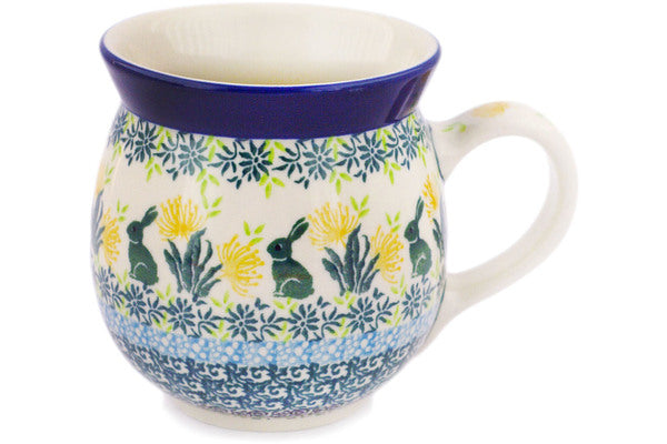 This Riveting Rabbits 16 oz Bubble Mug was handmade and hand decorated in Boleslawiec, Poland by skilled artisans according to old traditional methods. This is a Polish pottery Signature Unikat, which means that it has been hand painted with both sponges and brushes and it is signed by the artist who painted it. Unikat pieces are the most intricate works of art. Larger Unikat items take hours of very careful work to finish. This Polish stoneware is microwave, dishwasher, freezer, and oven safe up to 480°F. It does not contain lead or cadmium. It is part of the Riveting Rabbits Collection.