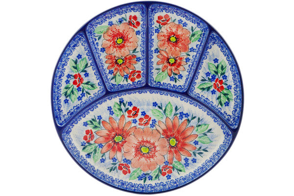 This Peak Of Perfection 10" Divided Dish was handmade and hand decorated in Boleslawiec, Poland by skilled artisans according to old traditional methods. This is a Polish pottery Signature Unikat, which means that it has been hand painted with both sponges and brushes and it is signed by the artist who painted it. Unikat pieces are the most intricate works of art. Larger Unikat items take hours of very careful work to finish. This Polish stoneware is microwave, dishwasher, freezer, and oven safe up to 480°F. It does not contain lead or cadmium. It is part of the Peak Of Perfection Collection.