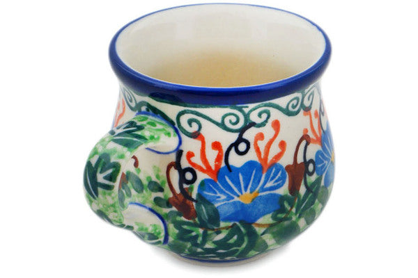This Pensamiento 2 oz Espresso Cup was handmade and hand decorated in Boleslawiec, Poland by skilled artisans according to old traditional methods. This is a Polish pottery Signature Unikat, which means that it has been hand painted with both sponges and brushes and it is signed by the artist who painted it. Unikat pieces are the most intricate works of art. Larger Unikat items take hours of very careful work to finish. This Polish stoneware is microwave, dishwasher, freezer, and oven safe up to 480°F. It does not contain lead or cadmium. It is part of the Pensamiento Collection.