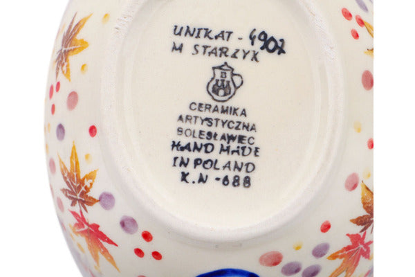 This Perfect Autumn 20 oz Gravy Boat with Saucer was handmade and hand decorated in Boleslawiec, Poland by skilled artisans according to old traditional methods. This is a Polish pottery Signature Unikat, which means that it has been hand painted with both sponges and brushes and it is signed by the artist who painted it. Unikat pieces are the most intricate works of art. Larger Unikat items take hours of very careful work to finish. This Polish stoneware is microwave, dishwasher, freezer, and oven safe up to 480°F. It does not contain lead or cadmium. It is part of the Perfect Autumn Collection.