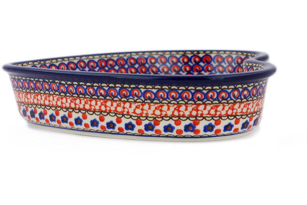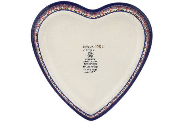 This Crimson Poppies 8" Heart Shaped Bowl was handmade and hand decorated in Boleslawiec, Poland by skilled artisans according to old traditional methods. This is a Polish pottery Signature Unikat, which means that it has been hand painted with both sponges and brushes and it is signed by the artist who painted it. Unikat pieces are the most intricate works of art. Larger Unikat items take hours of very careful work to finish. This Polish stoneware is microwave, dishwasher, freezer, and oven safe up to 480°F. It does not contain lead or cadmium. It is part of the Crimson Poppies Collection.