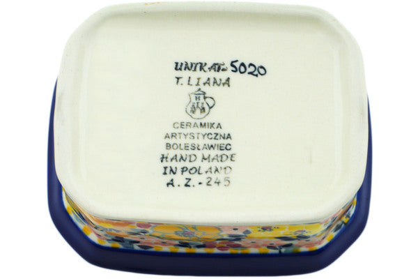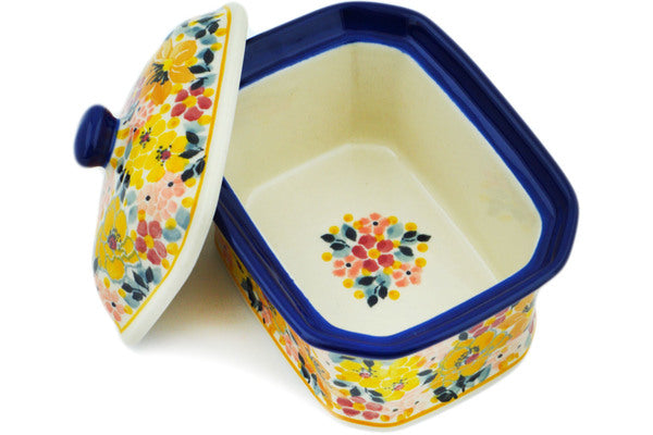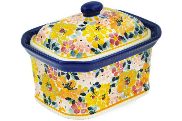 This Seasons Change 4" Mini Cake Box 4", Salt Box, was handmade and hand decorated in Boleslawiec, Poland by skilled artisans according to old traditional methods. This is a Polish pottery Signature Unikat, which means that it has been hand painted with both sponges and brushes and it is signed by the artist who painted it. Unikat pieces are the most intricate works of art. Larger Unikat items take hours of very careful work to finish. This Polish stoneware is microwave, dishwasher, freezer, and oven safe up to 480°F. It does not contain lead or cadmium. It is part of the Seasons Change Collection.