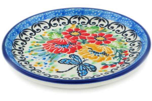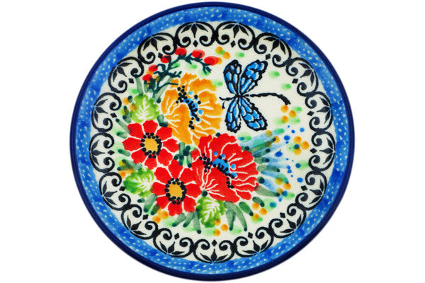 This Dragonfly Meadow 4" Mini Plate, Coaster plate was handmade and hand decorated in Boleslawiec, Poland by skilled artisans according to old traditional methods. This is a Polish pottery Signature Unikat, which means that it has been hand painted with both sponges and brushes and it is signed by the artist who painted it. Unikat pieces are the most intricate works of art. Larger Unikat items take hours of very careful work to finish. This Polish stoneware is microwave, dishwasher, freezer, and oven safe up to 480°F. It does not contain lead or cadmium. It is part of the Dragonfly Meadow Collection.