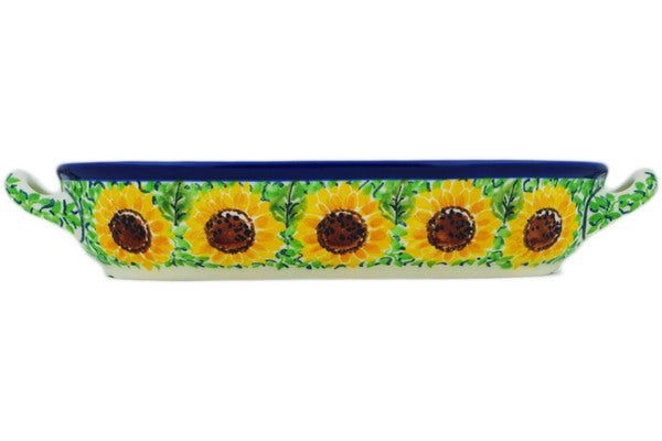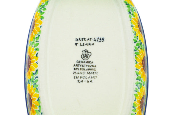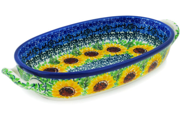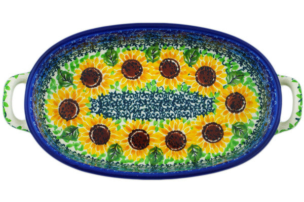 This Summer Sunnies 8-inch Oval Baker with Handles was handmade and hand decorated in Boleslawiec, Poland by skilled artisans according to old traditional methods. This is a Polish pottery Signature Unikat, which means that it has been hand painted with both sponges and brushes and it is signed by the artist who painted it. Unikat pieces are the most intricate works of art. Larger Unikat items take hours of very careful work to finish. This Polish stoneware is microwave, dishwasher, freezer, and oven safe up to 480°F. It does not contain lead or cadmium. It is part of the Summer Sunnies Collection.