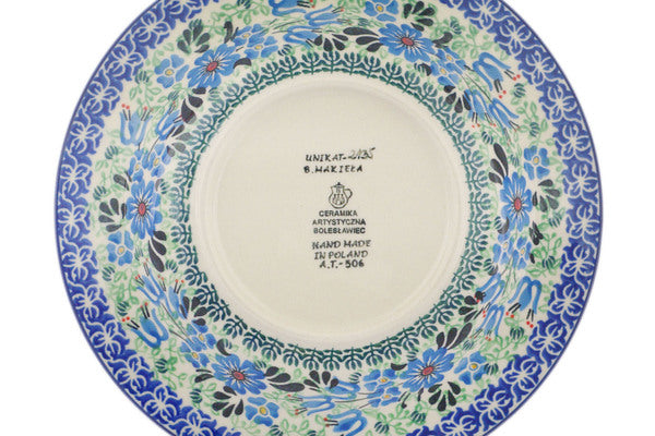 This Windswept Blues 9" Pasta Bowl was handmade and hand decorated in Boleslawiec, Poland by skilled artisans according to old traditional methods. This is a Polish pottery Signature Unikat, which means that it has been hand painted with both sponges and brushes and it is signed by the artist who painted it. Unikat pieces are the most intricate works of art. Larger Unikat items take hours of very careful work to finish. This Polish stoneware is microwave, dishwasher, freezer, and oven safe up to 480°F. It does not contain lead or cadmium. It is part of the Windswept Blues Collection.