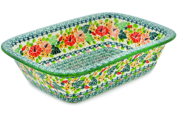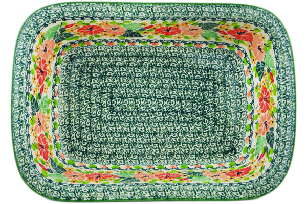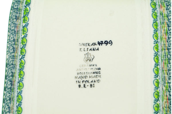 This Morning Divine 10" Rectangular Baker was handmade and hand decorated in Boleslawiec, Poland by skilled artisans according to old traditional methods. This is a Polish pottery Signature Unikat, which means that it has been hand painted with both sponges and brushes and it is signed by the artist who painted it. Unikat pieces are the most intricate works of art. Larger Unikat items take hours of very careful work to finish. This Polish stoneware is microwave, dishwasher, freezer, and oven safe up to 480°F. It does not contain lead or cadmium. It is part of the Morning Divine Collection.