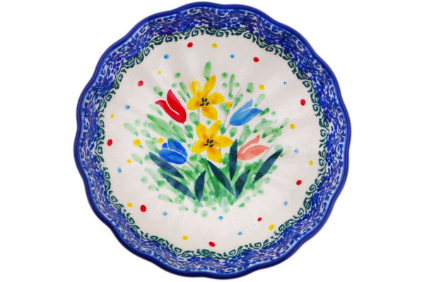 This Summer Tulip 5" Scalloped Fluted Bowl was handmade and hand decorated in Boleslawiec, Poland by skilled artisans according to old traditional methods. This is a Polish pottery Signature Unikat, which means that it has been hand painted with both sponges and brushes and it is signed by the artist who painted it. Unikat pieces are the most intricate works of art. Larger Unikat items take hours of very careful work to finish. This Polish stoneware is microwave, dishwasher, freezer, and oven safe up to 480°F. It does not contain lead or cadmium. It is part of the Summer Tulip Collection.