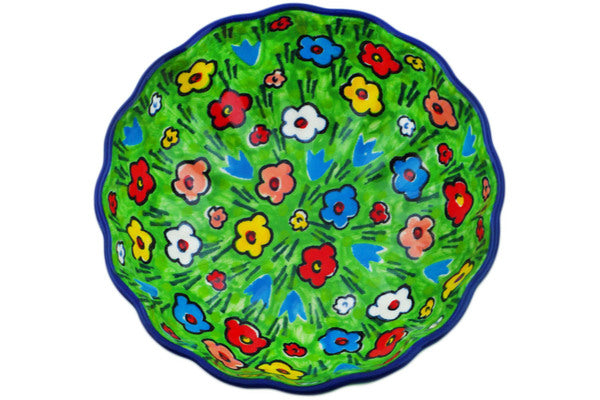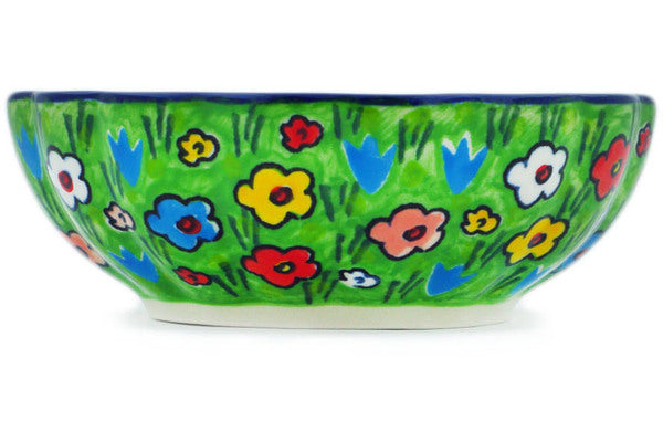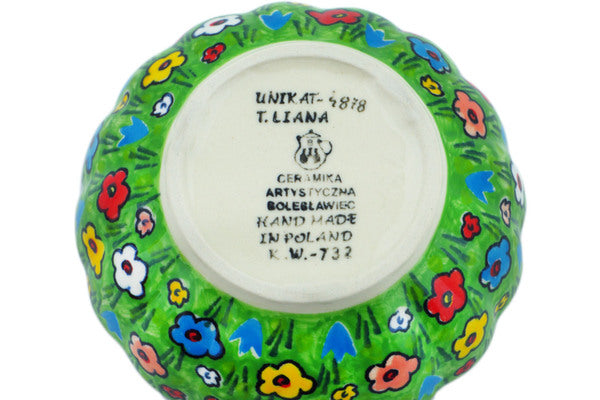 This Whimsical Garden 5" Scalloped Fluted Bowl was handmade and hand decorated in Boleslawiec, Poland by skilled artisans according to old traditional methods. This is a Polish pottery Signature Unikat, which means that it has been hand painted with both sponges and brushes and it is signed by the artist who painted it. Unikat pieces are the most intricate works of art. Larger Unikat items take hours of very careful work to finish. This Polish stoneware is microwave, dishwasher, freezer, and oven safe up to 480°F. It does not contain lead or cadmium. It is part of the Whimsical Garden Collection.