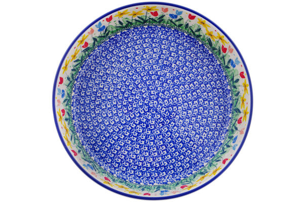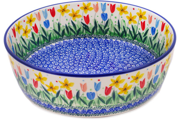 This Summer Tulip 9" Serving Bowl was handmade and hand decorated in Boleslawiec, Poland by skilled artisans according to old traditional methods. This is a Polish pottery Signature Unikat, which means that it has been hand painted with both sponges and brushes and it is signed by the artist who painted it. Unikat pieces are the most intricate works of art. Larger Unikat items take hours of very careful work to finish. This Polish stoneware is microwave, dishwasher, freezer, and oven safe up to 480°F. It does not contain lead or cadmium. It is part of the Summer Tulip Collection.