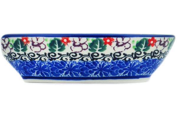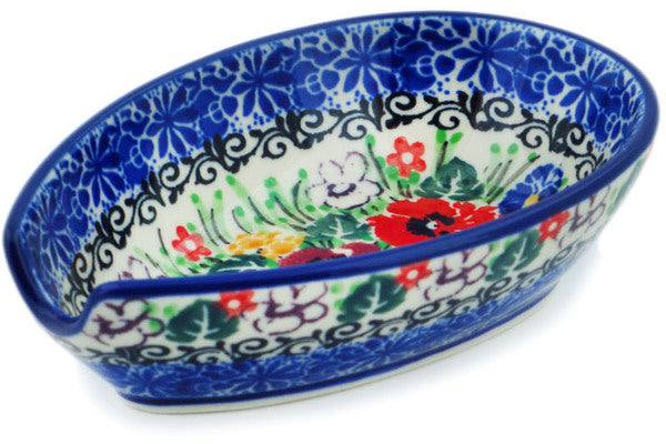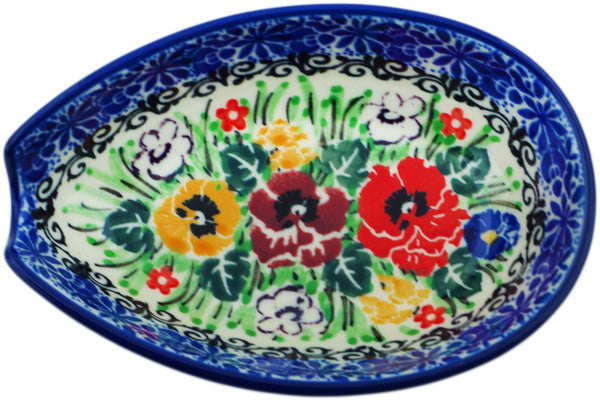 This Pansy Garden 5" Spoon Rest was handmade and hand decorated in Boleslawiec, Poland by skilled artisans according to old traditional methods. This is a Polish pottery Signature Unikat, which means that it has been hand painted with both sponges and brushes and it is signed by the artist who painted it. Unikat pieces are the most intricate works of art. Larger Unikat items take hours of very careful work to finish. This Polish stoneware is microwave, dishwasher, freezer, and oven safe up to 480°F. It does not contain lead or cadmium. It is part of the Pansy Garden Collection.