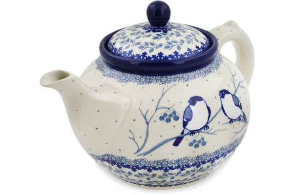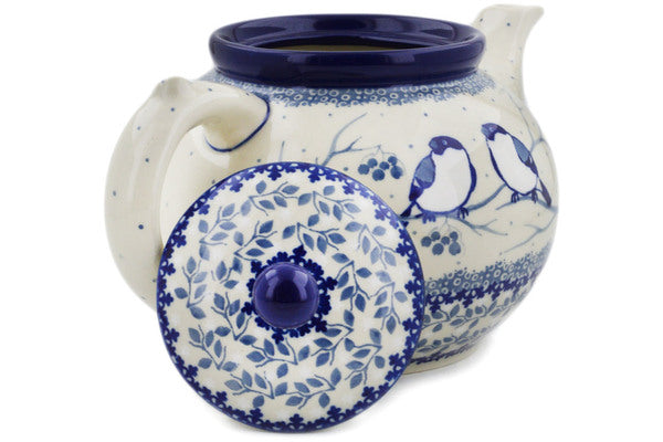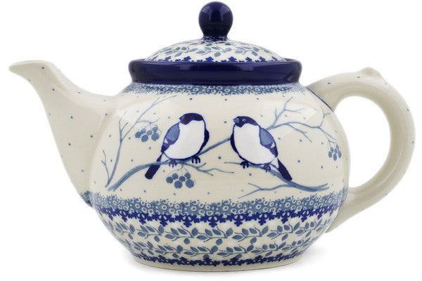 This Waiting Birds 5 cups Tea or Coffee Pot was handmade and hand decorated in Boleslawiec, Poland by skilled artisans according to old traditional methods. This is a Polish pottery Signature Unikat, which means that it has been hand painted with both sponges and brushes and it is signed by the artist who painted it. Unikat pieces are the most intricate works of art. Larger Unikat items take hours of very careful work to finish. This Polish stoneware is microwave, dishwasher, freezer, and oven safe up to 480°F. It does not contain lead or cadmium. It is part of the Waiting Birds Collection.