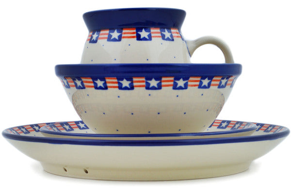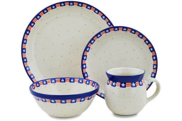 This Grand Old Flag 4-Piece Place Setting was handmade and hand decorated in Boleslawiec, Poland by skilled artisans according to old traditional methods. This Polish stoneware is microwave, dishwasher, freezer, and oven safe up to 480°F. It does not contain lead or cadmium. It is part of the Grand Old Flag Collection.