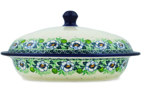 This Green Flora 12" Baker with Cover was handmade and hand decorated in Boleslawiec, Poland by skilled artisans according to old traditional methods. This Polish stoneware is microwave, dishwasher, freezer, and oven safe up to 480°F. It does not contain lead or cadmium. It is part of the Green Flora Collection.