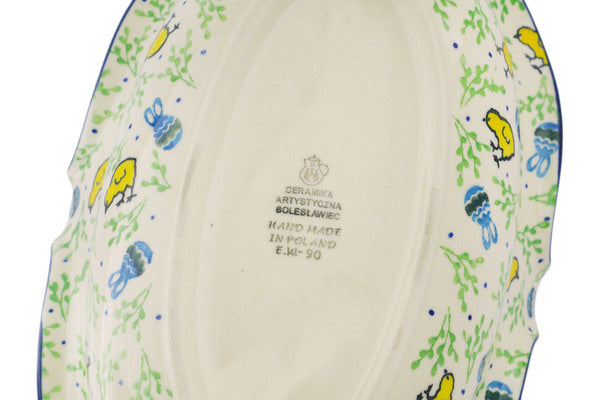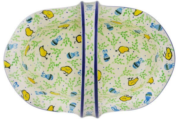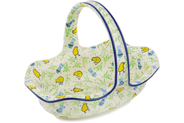 This Easter Day 11" Basket with Handle was handmade and hand decorated in Boleslawiec, Poland by skilled artisans according to old traditional methods. This Polish stoneware is microwave, dishwasher, freezer, and oven safe up to 480°F. It does not contain lead or cadmium. It is part of the Easter Day Collection.