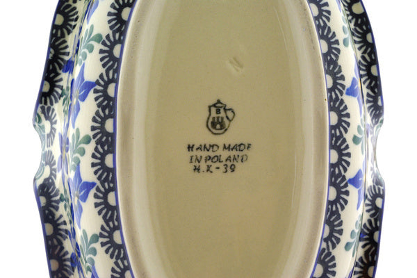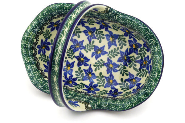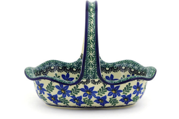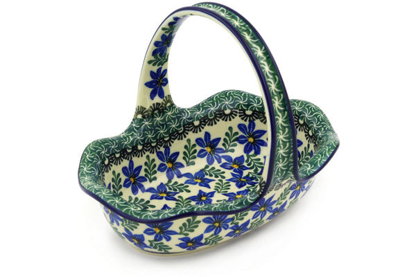 This Blue Violets 8" Basket with Handle was handmade and hand decorated in Boleslawiec, Poland by skilled artisans according to old traditional methods. This Polish stoneware is microwave, dishwasher, freezer, and oven safe up to 480°F. It does not contain lead or cadmium. It is part of the Blue Violets Collection.