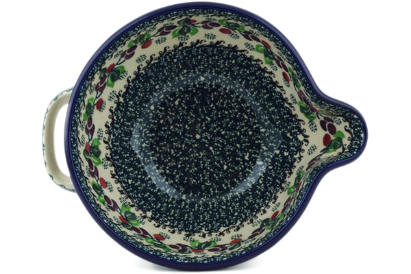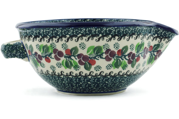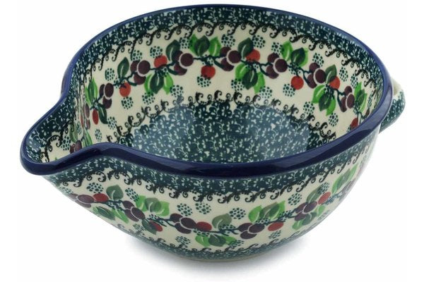 This Berry Garland 7½-inch Batter Bowl was handmade and hand decorated in Boleslawiec, Poland by skilled artisans according to old traditional methods. This Polish stoneware is microwave, dishwasher, freezer, and oven safe up to 480°F. It does not contain lead or cadmium. It is part of the Berry Garland Collection.