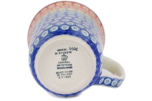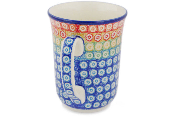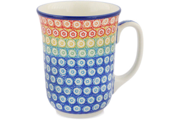 This Rainbow Meadow 17 oz Bistro Mug was handmade and hand decorated in Boleslawiec, Poland by skilled artisans according to old traditional methods. This is a Polish pottery Signature Unikat, which means that it has been hand painted with both sponges and brushes and it is signed by the artist who painted it. Unikat pieces are the most intricate works of art. Larger Unikat items take hours of very careful work to finish. This Polish stoneware is microwave, dishwasher, freezer, and oven safe up to 480°F. It does not contain lead or cadmium. It is part of the Rainbow Meadow Collection.
