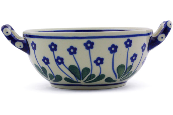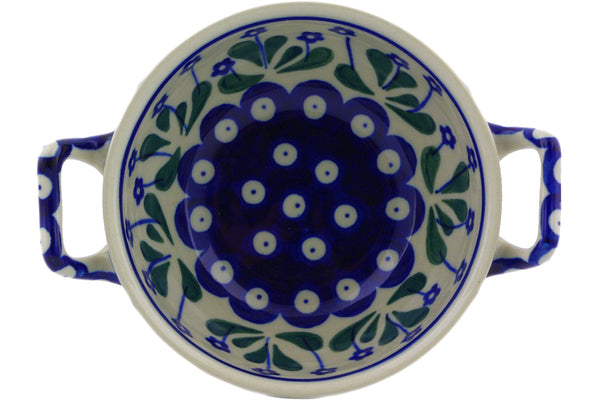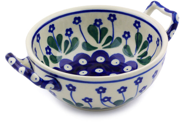 This Forget-Me-Not Peacock 10 oz Bouillon Cup was handmade and hand decorated in Boleslawiec, Poland by skilled artisans according to old traditional methods. This Polish stoneware is microwave, dishwasher, freezer, and oven safe up to 480°F. It does not contain lead or cadmium. It is part of the Forget-Me-Not Peacock Collection.