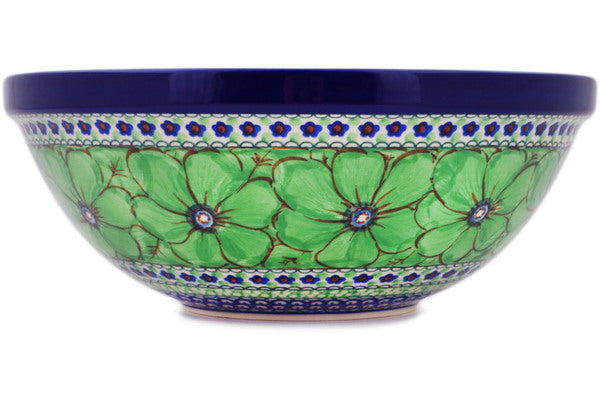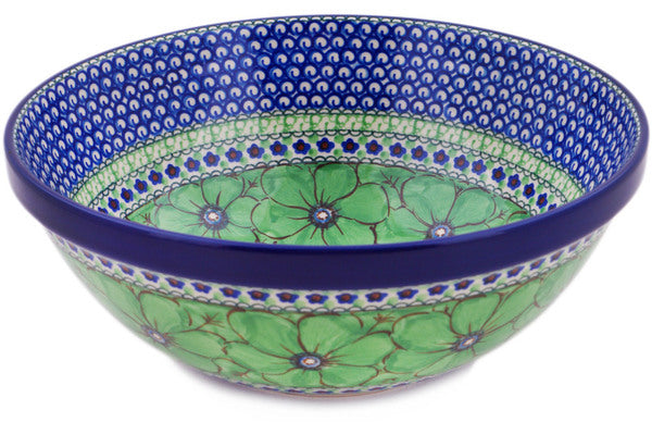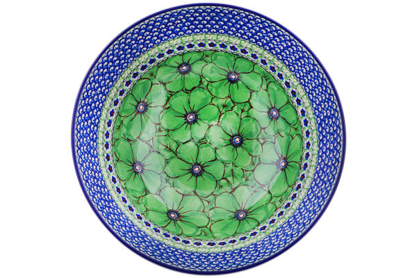 This Green Pansies 11" Bowl was handmade and hand decorated in Boleslawiec, Poland by skilled artisans according to old traditional methods. This is a Polish pottery Signature Unikat, which means that it has been hand painted with both sponges and brushes and it is signed by the artist who painted it. Unikat pieces are the most intricate works of art. Larger Unikat items take hours of very careful work to finish. This Polish stoneware is microwave, dishwasher, freezer, and oven safe up to 480°F. It does not contain lead or cadmium. It is part of the Green Pansies Collection.